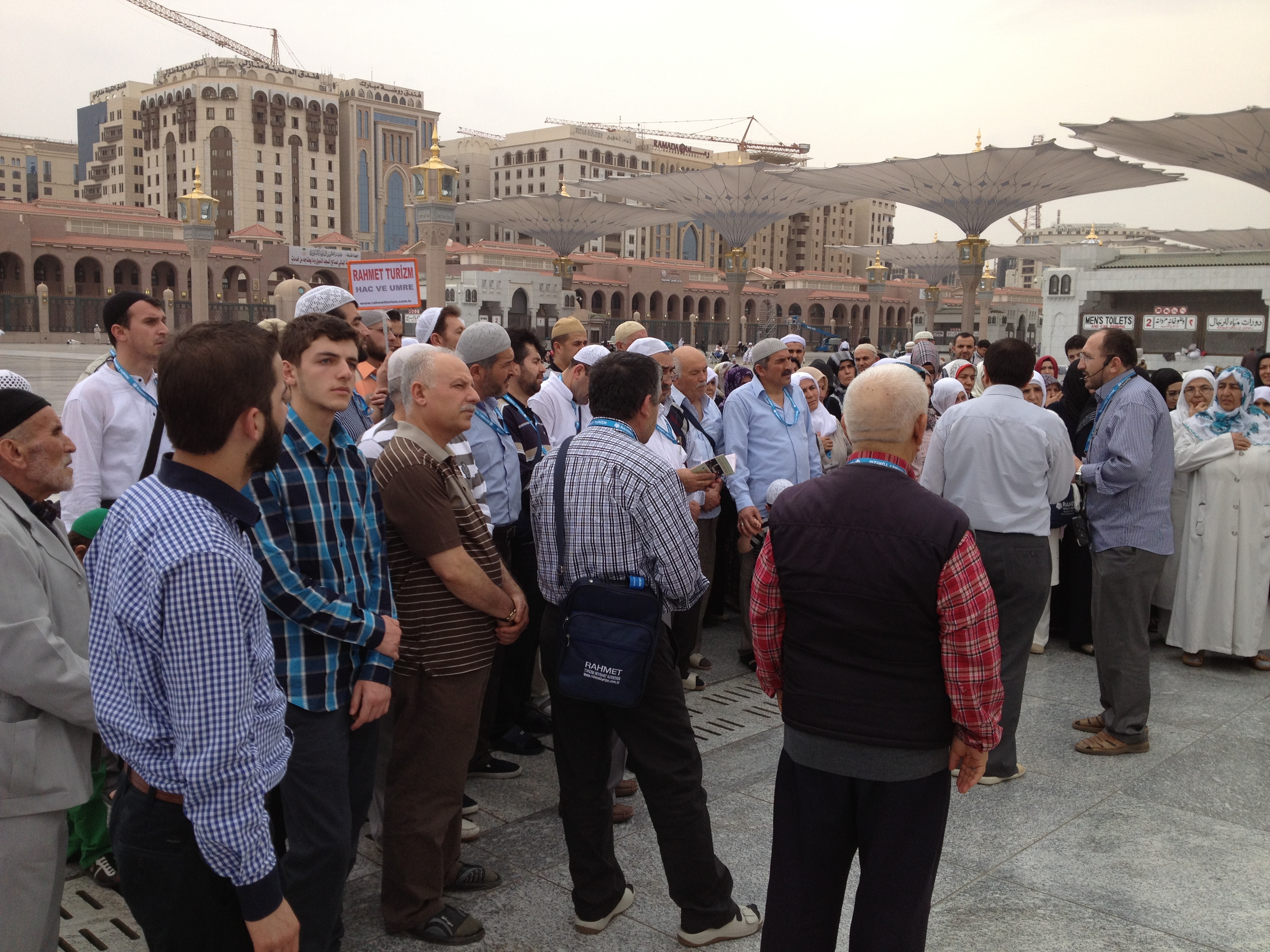 Rahmet Tur ekibi bizleri havaalanında karşıladı. Gerekli pasaport, valizlerin verilmesi, çıkış pulu alınması v.s. gibi işlemlerimizi hallettiler. Refakatçi hocalarımızla birlikte sabah yedi uçağı ile havalandık. Uçakta merkezi yayın sistemi ile Rahmet Tur hocalarımızdan sohbetler dinleyerek bir nevi kalbimizi kutsal beldelere hazır hale getirdik, topluca dualar edildi. Genelde turlardan herkes şikâyetçiydi. Haliyle bizde temkinli yaklaştık. Ancak tereddüdümüzün yersiz olduğunu kısa zamanda anladık. Medine’ye saat onda indik. Medine havaalanını problemsiz bir şekilde geçerek Mukaddes Beldelerin kapısını araladık. İlk gidenlerde heyecan ikinci gidenlerde özlem gidermek arzusu